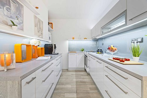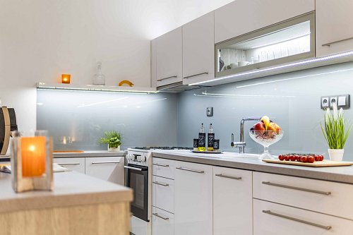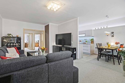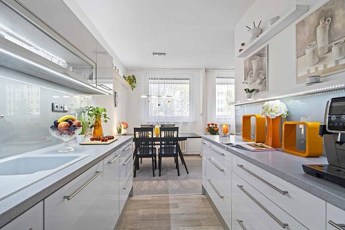 Dominantou bytu je vzdušný a útulný obývací pokoj s kuchyňským koutem zalitý odpoledním sluncem. Kuchyňská linka byla zrozena pro Vaše kulinářské mistrovství a rodinné gurmánské zážitky.