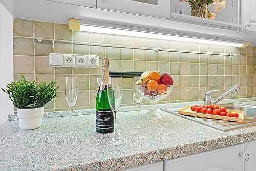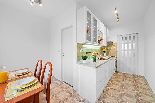 - Praktická kuchyň: Místo, kde si snadno připravíte snídani nebo hostinu pro přátele. Kuchyňská linka nabízí dostatek úložného i pracovního prostoru.