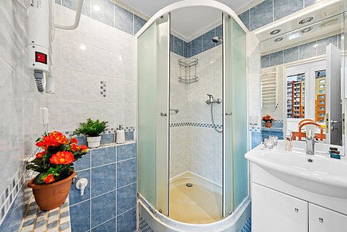 - Koupelna ve stylu řeckých lázní se sprchovým koutem je ideální pro osvěžení po náročném dni.
