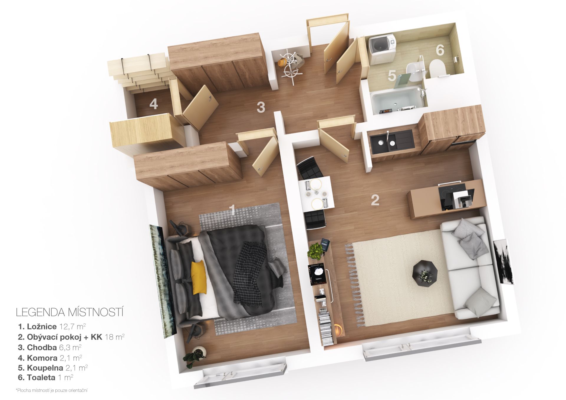 Útulný byt má velmi praktickou dispozici, obývací pokoj s kuchyňským koutem a ložnici (dva neprůchozí pokoje), dále koupelnu s toaletou, vstupní chodbu, praktickou komoru na uložení věcí a sklepní kóji.